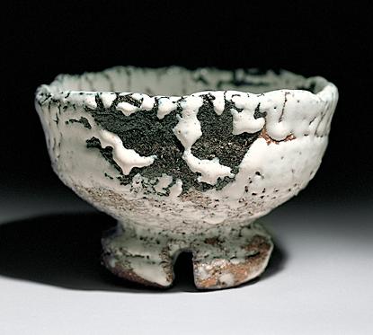 萩烧竹节井户:萩烧竹节井户是模仿高丽大井户的作品,但是增加了两个新特点,一个是淡淡得挂白釉,也就是上图这种有点旺旺雪饼的感觉。另一个就是不再在高台施梅花皮。听说是因为当时找不到梅花皮的釉料。而高台改成竹节的形状,上釉或者露出。同时为了人为增加贯入,在釉中混合了大量的小石头,烧造时破裂,留下的小洞可以让茶渍流入,让贯入出现黑色,高丽井户是没有这个故意的工序的。