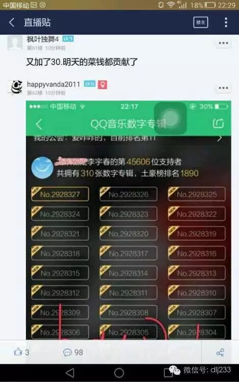 疯狂的粉丝 李宇春销量战胜杰伦?玉米已经拼命了! 娱乐圈里的一颗小毒瘤 内地女星 2016-06-28 14:53:08 190 创作不易,用心坚持,欢迎请BaGua喝几杯爱心咖啡!打赏并支持本文 打赏并删除本文 总所周知,周杰伦新专辑24号上线。已经取得不俗成绩,销量也达到百多万张。李宇春粉丝为了霸占腾迅销量榜首,这俩天也是拼了。。(看看玉米们的辛苦成果)《下个,路口,见》、《阿么》、《常旅客》、《籁赋》、《小朋友》、《活该》、《还有我疼你》、《蜀绣》、《WhyMe》等等 01.屋顶02.东风破03.简单爱04.借口05.安静06.安静07.可爱女人08.黄金甲09.龙卷风10.米兰的小铁匠11.开不了口12.黑色幽默等等等…… 创作不易,用心坚持,欢迎请BaGua喝几杯爱心咖啡!打赏并支持本文 打赏并删除本文 感谢您的支持鼓励,我会继续努力的!文章地址:用户邮箱:打赏金额:USDT 请输入数字点击”去打赏“,即可进行打赏支持本文章哦 李宇春 About the Author 娱乐圈里的一颗小毒瘤 功能介绍:我们不生产新闻,只是新闻的搬运工。 Related Posts 疯狂的粉丝 李宇春销量战胜杰伦?玉米已经拼命了! 2016-06-28 14:53:08 发表评论