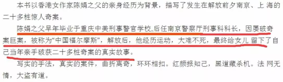 她的父亲任南京警察厅刑事科科长,屡破巨案,书中这些烧脑案件,可都是老爷子亲身经历亲手破获的。拥有第一手原始资料,自然更真实更曲折。