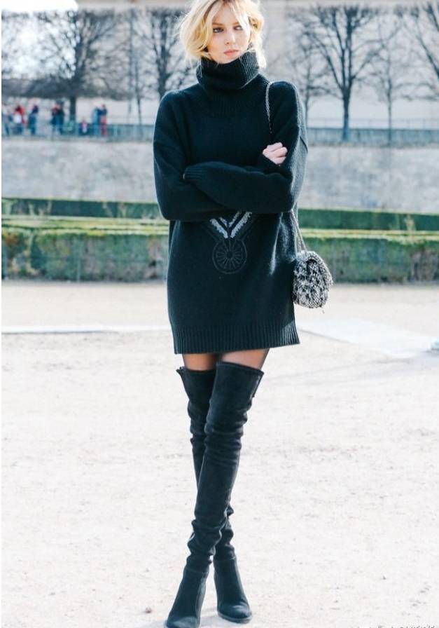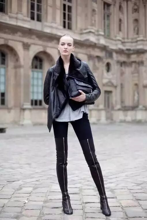 黑裤子搭配过膝长靴非常的帅气,不仅能够达到双层保暖的效果,视觉上也是非常的显瘦,尤其是同色系的搭配。