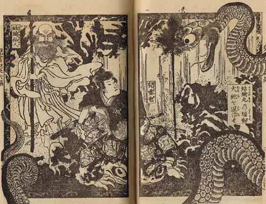 歌川国芳绘制的插画(蛞蝓仙人和儿雷也一起对抗大蛇丸)