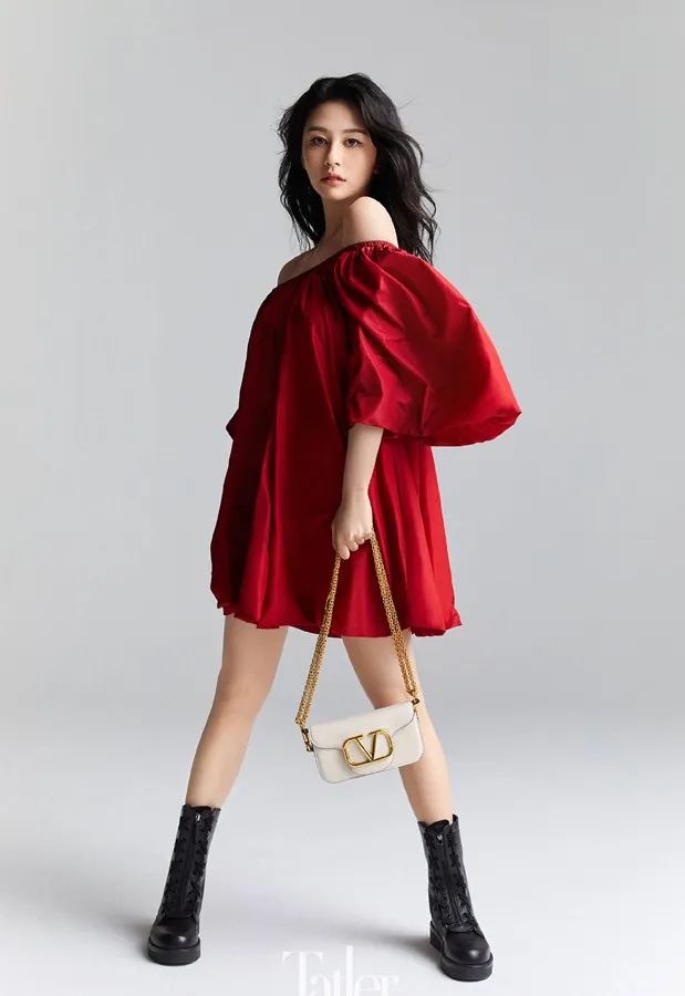 封面照片中,她身着一身红色一字肩短裙,露出好看的锁骨,搭配黑色马丁靴,十足的酷女孩装扮。