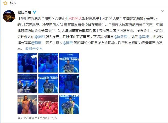发布会上作为水性科天环保大使的姚明,现场分享了当他看到孩子们蓝愿望时的感动:“孩子们的愿望是最纯真、最无邪的,作为父亲的我希望所有的孩子都不会受到家装污染的侵害,这需要我们所有人的努力”。现场出席无毒宣言的著名影视演员陈乔恩则表示家装材料是否环保是非常重要的事情。而作为兰州城市旅游形象大使的魏蔚则建议大家都采用无毒家装材料,从源头上杜绝家装污染的危害。歌手李琦现场为无毒家装宣言演唱了公益歌曲。