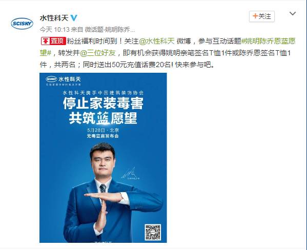 “我,姚明,今天郑重承诺,停止家装毒害,为实现中国孩子的蓝愿望而献出自己的一份力量。” 2016年5月28日,水性科天携手中国建筑装饰协会举办的“共筑蓝愿望,净享新明天”无毒宣言发布会在京落下帷幕。