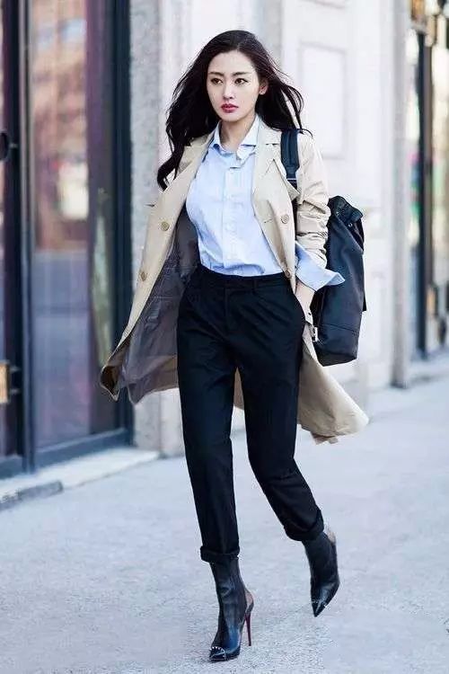 卡其色风衣配浅蓝色衬衫,再用黑色长裤配尖头细高跟靴子,张天爱示范了风衣的完美搭配方式,知性潇洒,也就只有瘦的人随便走起来都带风吧!