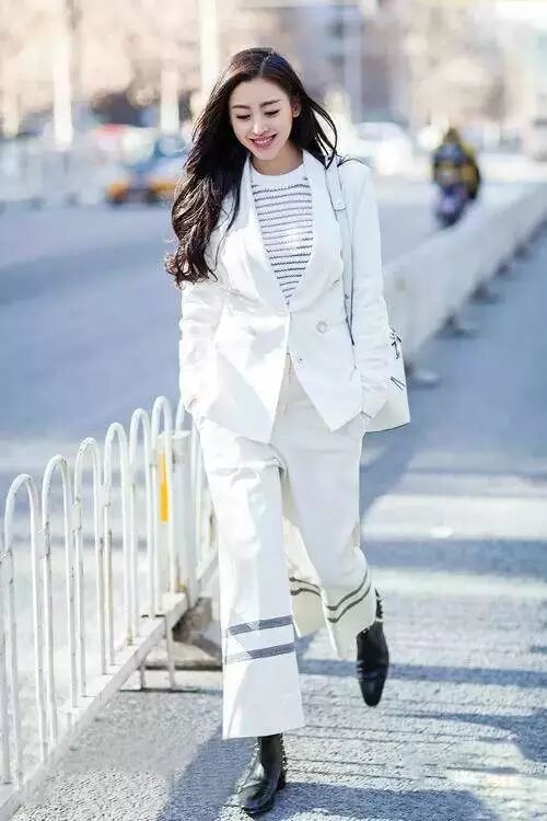 纯白的西装套装,阔腿裤搭配黑色短靴,率性十足。