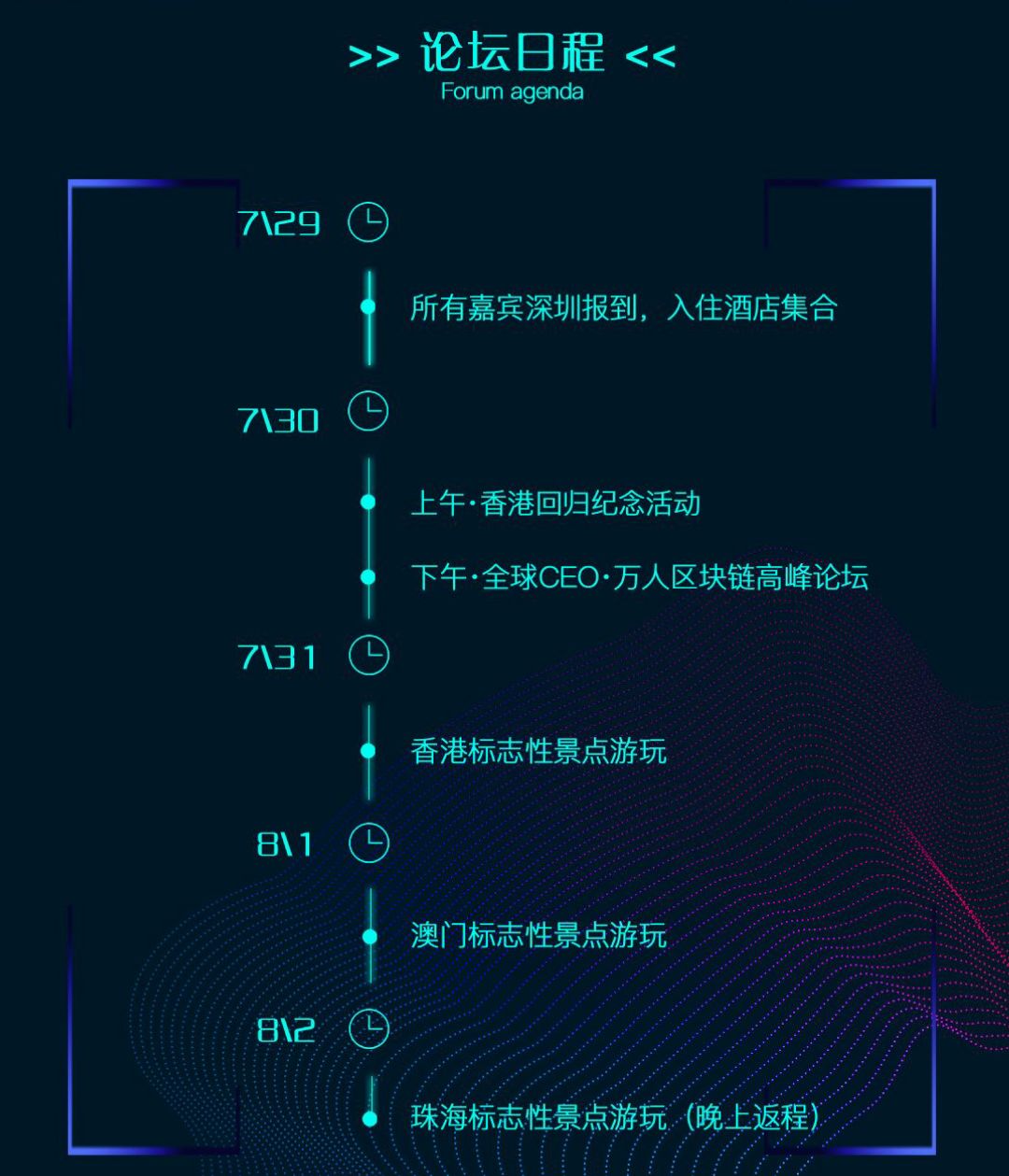 这场会议将持续五天四夜,会上不仅有关于区块链的各种知识干货,还能近距离和行业类知名人士探讨区块链未来的发展方向,获取行业内最新讯息,同时,还有各种优质项目介绍,更能玩转香港澳门各大景点,最重要的是这场活动全程免费!