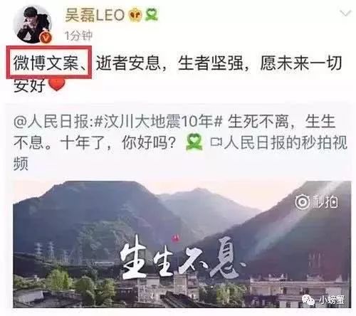 很多时候,公司拟好文案明星直接复制发微博其实是大家心照不宣没有点破的,但地震纪念日这种严肃的日子,连“抄作业”都这么不用心,就有些说不过去了,何况吴磊老家还是四川的