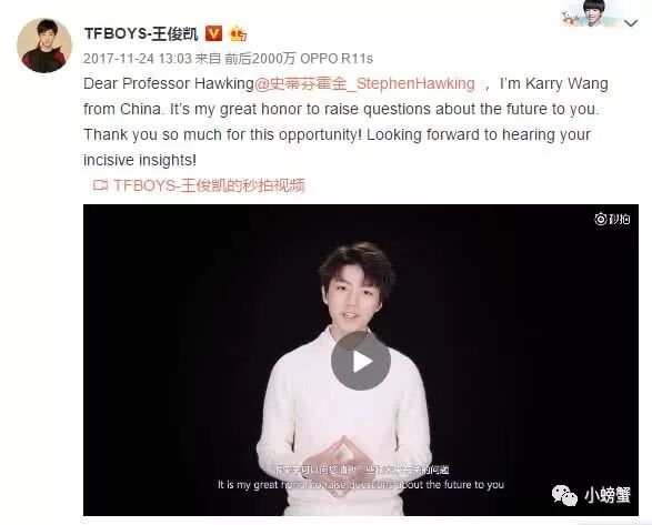 在微博全英文发言向霍金请教问题,霍金亲自回复,因为流利的英文登上微博热搜第一名。被任命为“联合国环境署亲善大使”并全英文演讲,继续上热搜