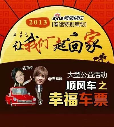 2013年春运之际,李易峰联合新浪浙江发起“顺风车之幸福车票”公益活动。尽管活动只能在有限范围的省市开展,在山东地区近600人收到火车车票,560人获乘大巴车回家过年,在杭州有210位网友领到车票。