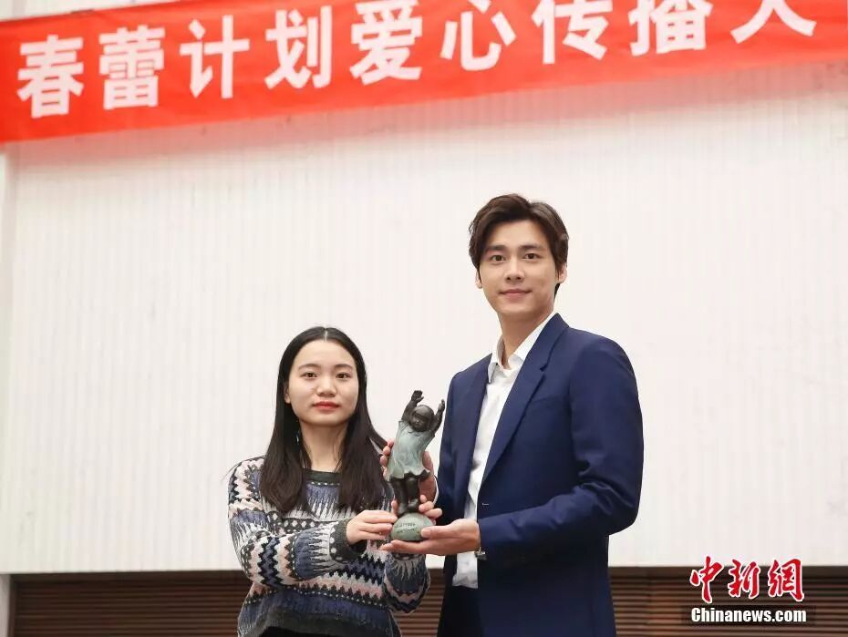 作为优秀春蕾女童代表的北京大学研究生肖娇向李易峰送上象征春蕾女童的雕塑“溪水清清”,并感谢李易峰对“春蕾计划”的爱心呼吁和资助。