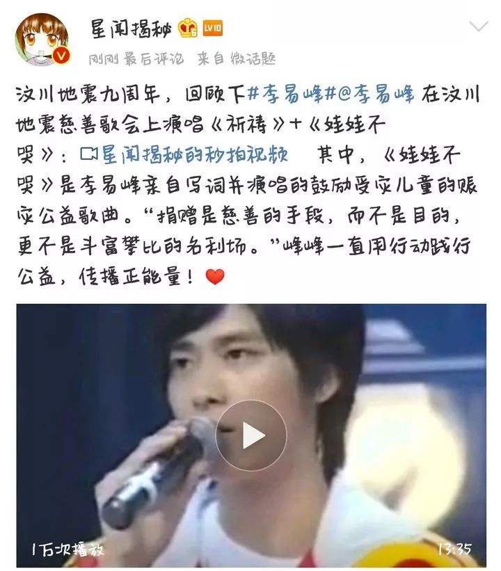 2008年5月,李易峰与制作团队一起连夜进棚创作,通宵录唱了为家乡四川地震特别谱写的赈灾公益歌曲《娃娃不哭》。