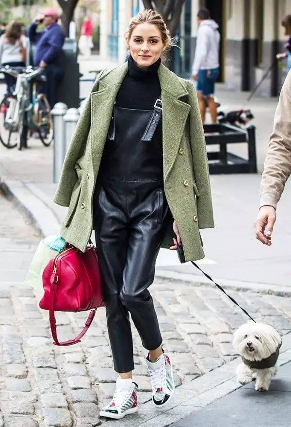 墨绿色的长大衣配拼接款运动鞋,穿出潇洒干练的气质,拼接款的链条包格外精致。▼