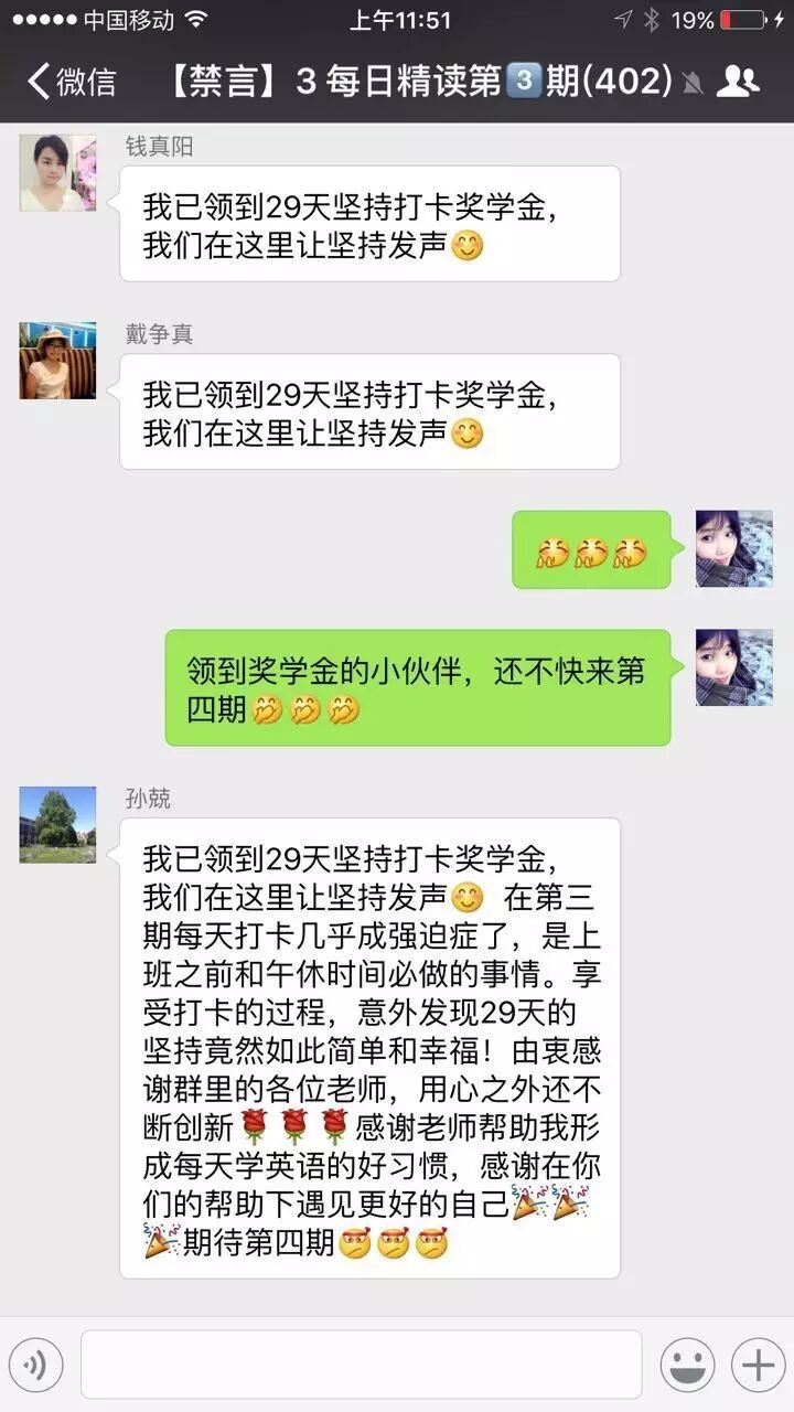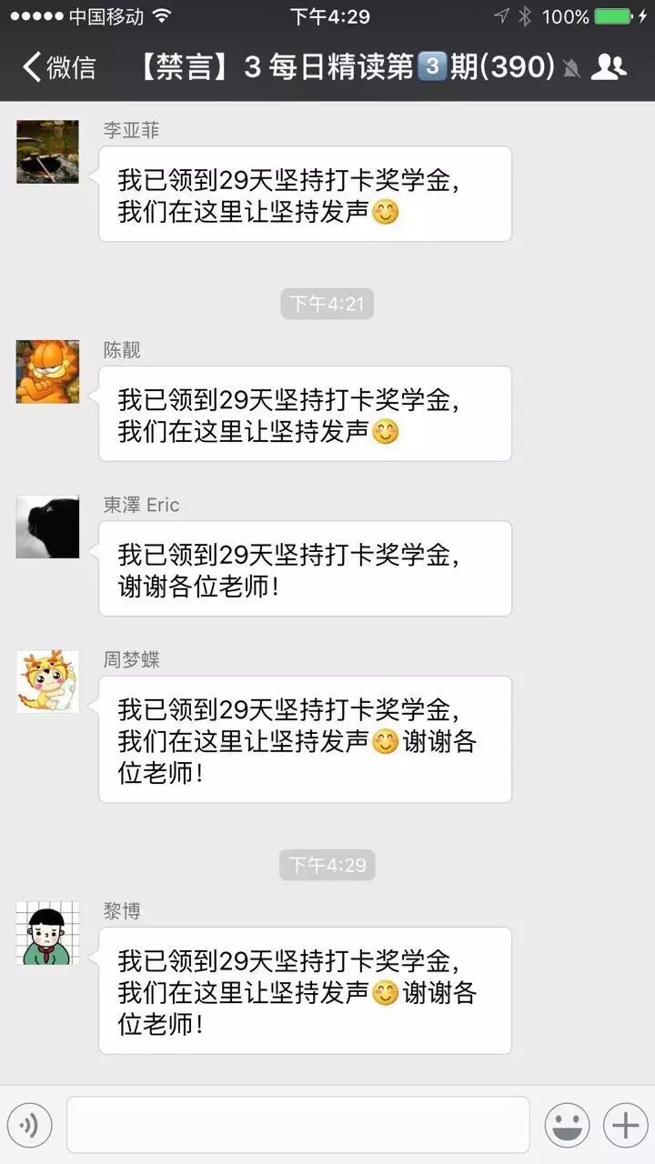 后来,今天我看到一条条的“我已经领到29天坚持打卡奖学金,我们在这里让坚持发声!”