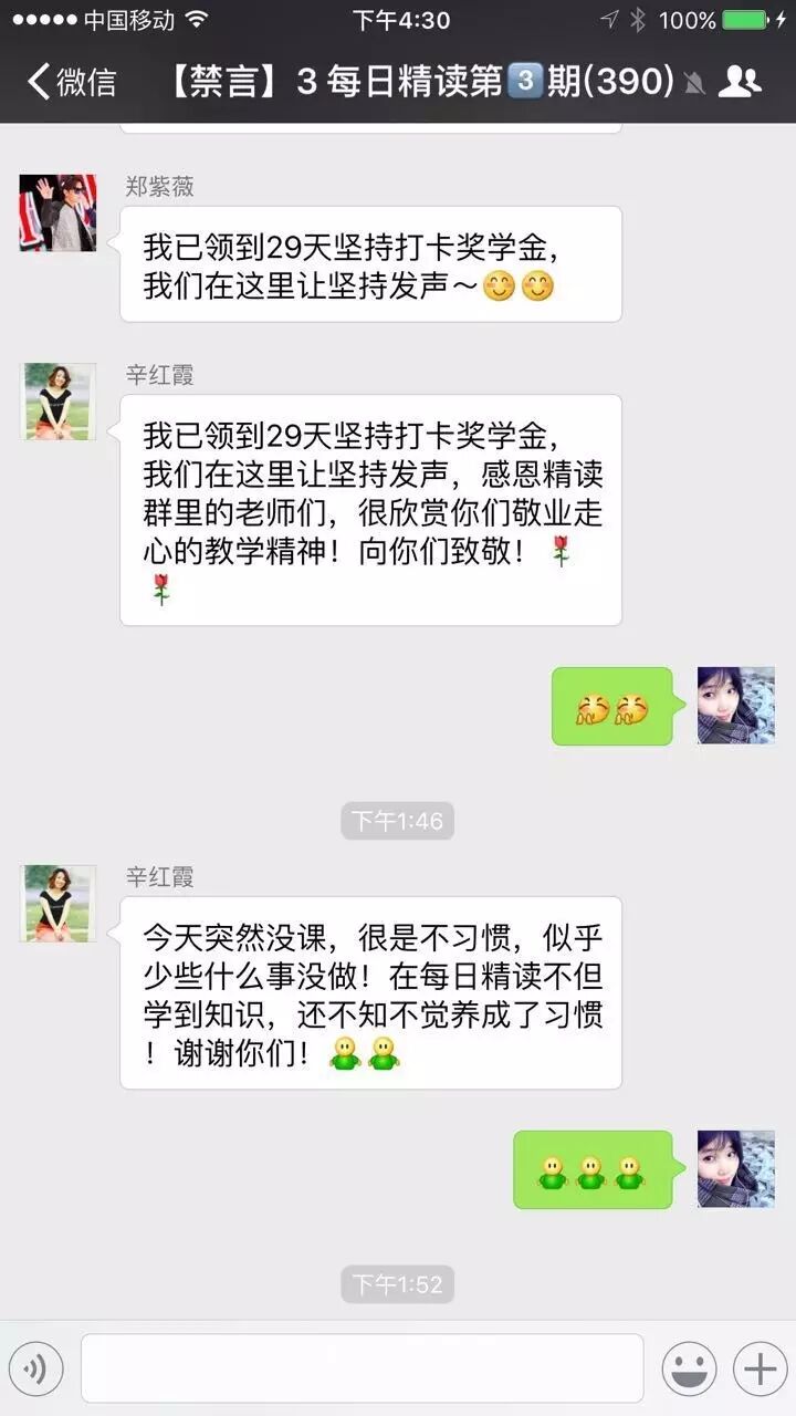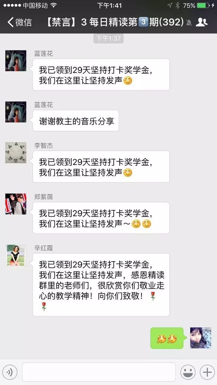 学生是最挑剔的,也是最宽容的。他们非常可爱,记得他们起哄让每个人唱歌,最后被我的歌声吓退;有个学生叫李白,跟我哭诉,29天好长,她坚持了28天,一天没坚持,没有拿到奖学金,很郁闷。我说29天坚持了28天,难道不是一个接近完美的结局吗?有个学生叫Jennifer每次老师答疑,都自己掏红包,把那些的潜水的学生炸出来;有个学生叫陆剑,推荐了身边10多个朋友一起学习;有个学生叫zhuzhu,每天把自己的笔记晒在朋友圈中,用于自我鼓励;有个学生(不透露姓名了)正在接受放疗,仍旧在坚持每天打卡学习…还有很多学生在默默的坚持,每看到一个学生打卡,我都觉得劳动果实得到了尊重,也觉得自己又帮到了一个学生一次,福祉又多了些。有这么多可爱的光辉的学生在一起,这不也正是我们几个老师坚持下去的动力吗?