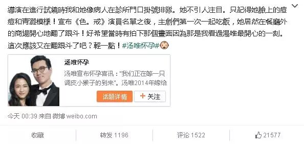 汤唯怀孕 王力宏道贺并爆料其接下《色戒》后翻跟头庆祝 央广网娱乐 港台男星 2016-02-27 18:14:37 103 创作不易,用心坚持,欢迎请BaGua喝几杯爱心咖啡!打赏并支持本文 打赏并删除本文 点击上方“公众号”可订阅哦!欢迎关注央广网娱乐http://ent.cnr.cn微信号:entcnr“女神汤唯怀孕啦!近日有网友拍到汤唯挺孕肚和老公逛街。汤唯2014年嫁给《晚秋》导演金泰勇,成为韩国媳妇,随后低调举办婚礼。昨日,汤唯正式宣布已经怀孕准备当妈妈。她发文称,“各位亲朋好友,泰勇和汤汤开春来报喜,正在等一只调皮小猴子的到来”。今日凌晨,曾与她在《色戒》有过合作的王力宏发文恭喜。王力宏透露,当年在宣布《色戒》演员名单之后,主创们第一次一起吃饭,她居然在餐厅外的商场开心地翻了跟斗!好希望当时有拍下那个画面因为那是我看过汤唯最开心的一刻。他调侃称:“这次应该又在翻跟斗了吧?轻一点。”王力宏微博截图王力宏与汤唯在《色戒》里的剧照点击阅读原文了解更多详情 创作不易,用心坚持,欢迎请BaGua喝几杯爱心咖啡!打赏并支持本文 打赏并删除本文 感谢您的支持鼓励,我会继续努力的!文章地址:用户邮箱:打赏金额:USDT 请输入数字点击”去打赏“,即可进行打赏支持本文章哦 王力宏 About the Author 央广网娱乐 功能介绍:品牌宣传、内容推广 官方认证:央广新媒体文化传媒(北京)有限公司 Related Posts 汤唯怀孕 王力宏道贺并爆料其接下《色戒》后翻跟头庆祝 2016-02-27 18:14:37 【红尘面对面】张洪量:音乐才子的沉迷与独醒 2016-01-25 17:26:41 饭岛爱官方博客正式关闭 粉丝写7万留言 2015-11-01 18:02:55 发表评论