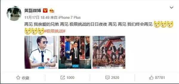 《极限挑战》于昨晚收官,黄磊在自己的微博感慨到“再见,我们终会再见”