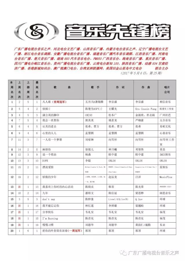 音乐先锋榜|2017年第25周成绩揭晓:五月天、萧敬腾夺冠! 声报 港台男星 2017-05-07 17:36:29 371 创作不易,用心坚持,欢迎请BaGua喝几杯爱心咖啡!打赏并支持本文 打赏并删除本文 点击上方声报,进入广播的声动世界!音乐先锋榜本期榜单(2017年第25期):冠军: 五月天、萧敬腾 —《凡人歌》亚军:陈楚生、SPY.C —《侦探C》季军:GNZ48 —《蒲公英的脚印》微信号:声报更多精彩内容,请长按此处关注 创作不易,用心坚持,欢迎请BaGua喝几杯爱心咖啡!打赏并支持本文 打赏并删除本文 感谢您的支持鼓励,我会继续努力的!文章地址:用户邮箱:打赏金额:USDT 请输入数字点击”去打赏“,即可进行打赏支持本文章哦 萧敬腾 About the Author 声报 功能介绍:权威的广播电视资讯/新鲜热辣的娱乐动态/富有品味的文化大餐/体贴实用的服务信息 Related Posts 全球华语歌曲排行榜 | 第866期成绩:五月天、萧敬腾夺冠 2017-05-07 17:36:29 音乐先锋榜|2017年第25周成绩揭晓:五月天、萧敬腾夺冠! 2017-05-07 17:36:29 音乐先锋榜|第36周成绩揭晓 :张韶涵首周冠军! 2016-09-11 20:32:44 好期待 梁永斌加盟体育节目?! 2016-06-20 17:42:30 李克勤 容祖儿:爱·表述(内有专访音频……) 2016-06-02 22:13:05 发表评论