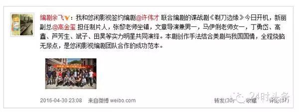 4月30日,谍战剧《剃刀边缘》开机,该剧由文章[微博]导演,余飞和许伟才联合编剧,文章、马伊琍夫妻二人分别担纲男女主演。在编剧余飞po出的照片中,可以看到剧组成员大合影及开机仪式,马伊琍和文章紧紧靠在一起。