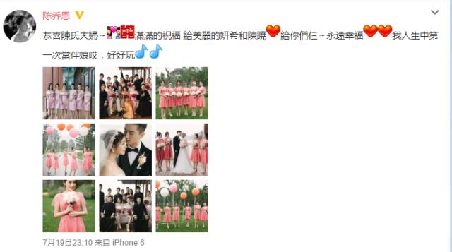 本来“最美伴娘团”出来的照片是美die的!结果有细心的网友就发现,乔恩发微博祝福的同时还不忘给阿娇P图。