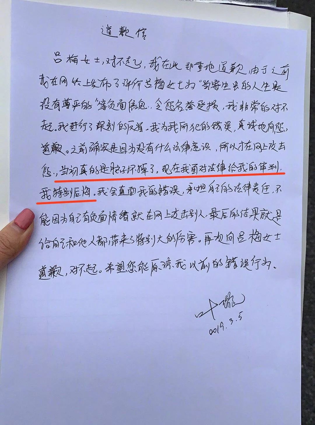 除了乖乖交纳罚款,当场删除侵权微博,叶璇还手写了一封致歉信,承认自己“当初真的是脑子坏掉了”,因为自己有负面情绪,就攻击别人。