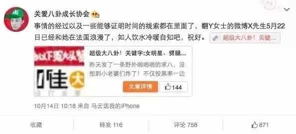 2015年10月,著名的八卦成长协会曝出一件大新闻,指出某女明星的男友在这段恋情之前曾脚踩多只船。