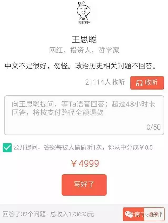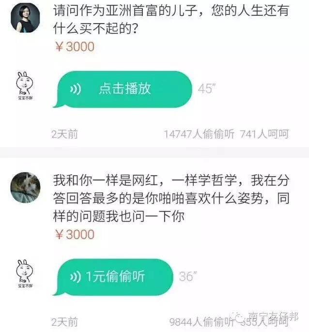 王思聪上周末入驻了最近在微信上刷屏的语音问答平台,和粉丝互动。不过看看价格,我等屌丝只能忍了。