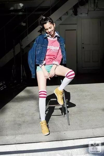 女生球袜像水原希子这样穿也OK,外面套个深色牛仔衫稳住过多颜色带来的混乱,腿长马上一米八!