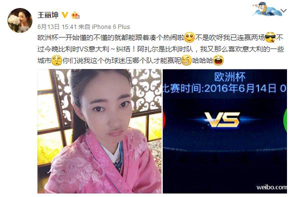 王丽坤拍戏之余在意大利VS比利时前夕,不忘叫上粉丝“赌球”哈哈。