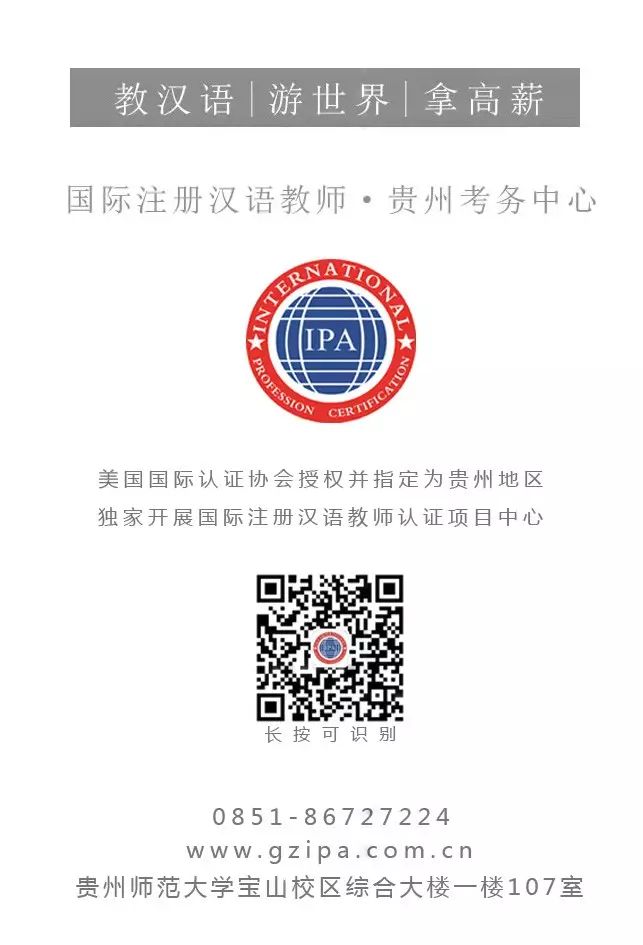 国际注册汉语教师贵州考务中心是国际认证协会(IPA)指定的国际注册汉语教师认证项目贵州唯一授权官方考点,联合贵州大学、贵州师范大学在贵州独家开展国际注册汉语教师项目报名、培训、认证、 出国就业、国际交流...