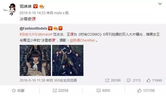 在微博中,范冰冰有趣的用四个字来冠名与王源的友情——冰雪奇源