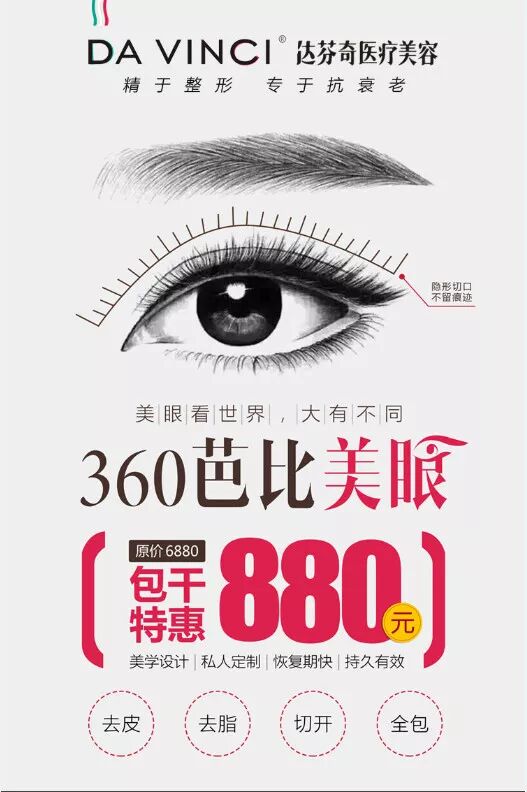 现在达芬奇正在搞活动,880元就可以做360芭比美眼,超级大优惠,隐形切口还不留痕迹!