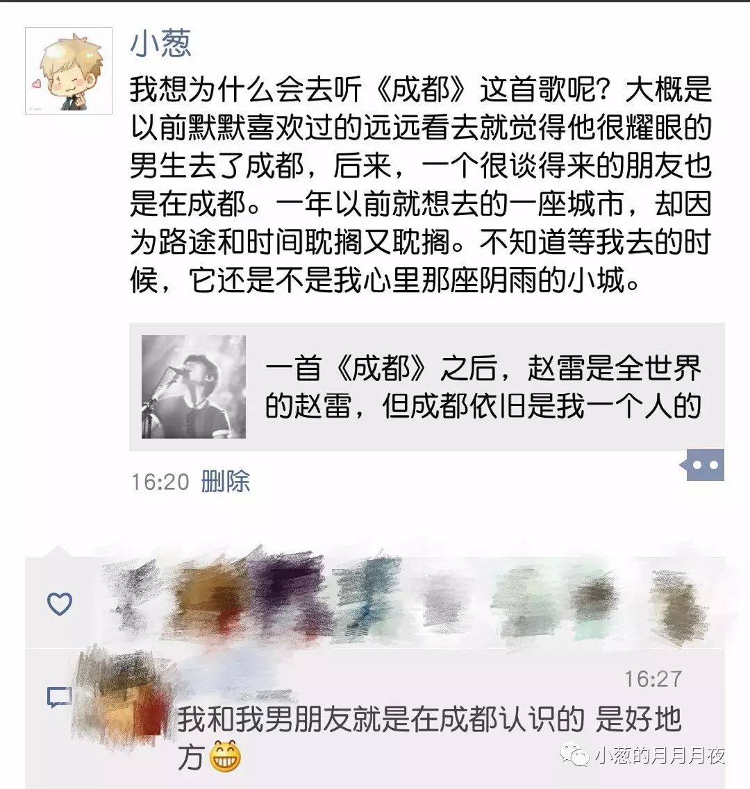 其实在写这篇文字的时候,我内心挺紧张的。因为写到那个男生的时候,看到他恰好评论了我那篇转发关于《成都》的朋友圈。我不知道他有没有看出来那几句话说的是他,但是加上这篇推送,傻子都能看出来了。有点怕他看到这篇推送,怕以前的同学知道我说的是他,怕自己下次见到他的时候,还是不敢看他的眼睛,但却固执的一定要写出一首歌一座城市带来的少女心。毕竟“所有和你爱过的人有关的城市都会变得特殊,你初次来到,而那个人无处不在。”而今,只是谢谢曾经的少年给我写下这篇文字的灵感,再无其他。