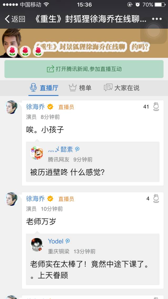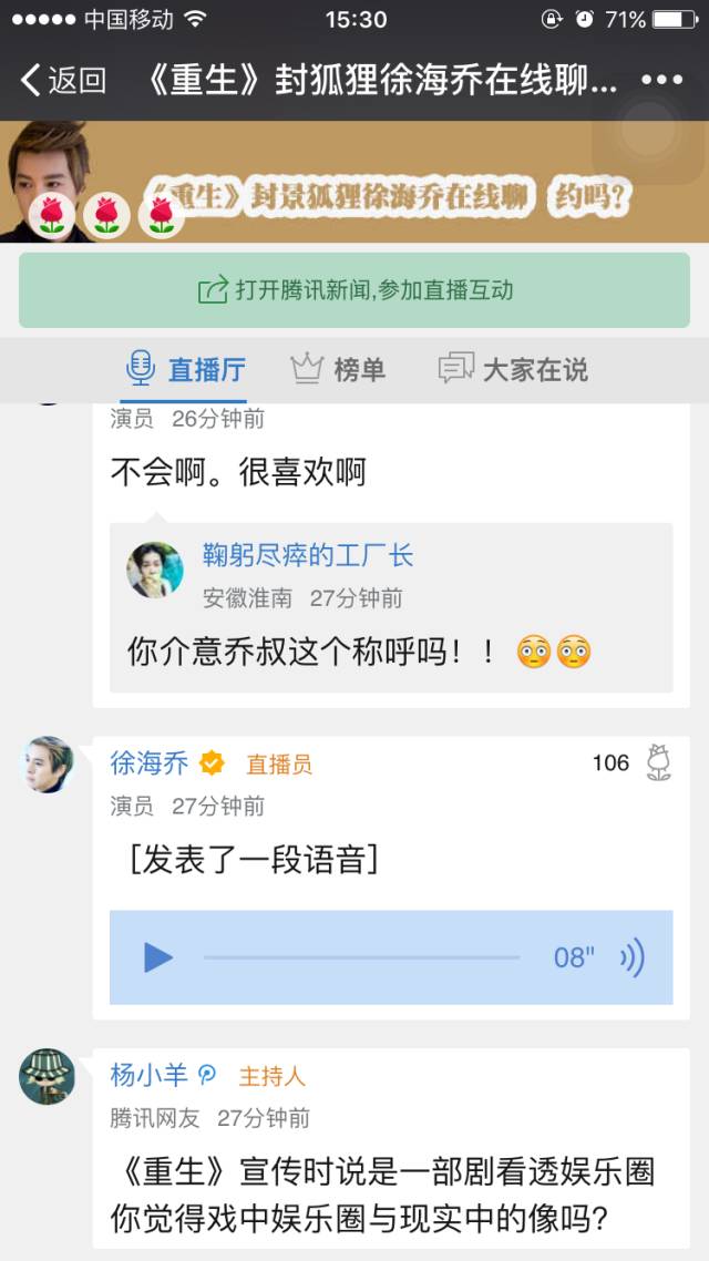 艾瑞巴蒂,周四啦,有毒的《重生》今晚又要更新啦~ 更激动的是,今天下午封狐狸徐海乔空降腾讯视频娱乐页卡剧星online节目,人气爆棚,苏苏的声音有撩到你吗?不仅会撩,封狐狸还是段子手一枚呢~ 更是卖萌小能手呢, 嘤嘤嘤,小鹅的少女心呀,已经彻底成为乔叔的小迷妹了~