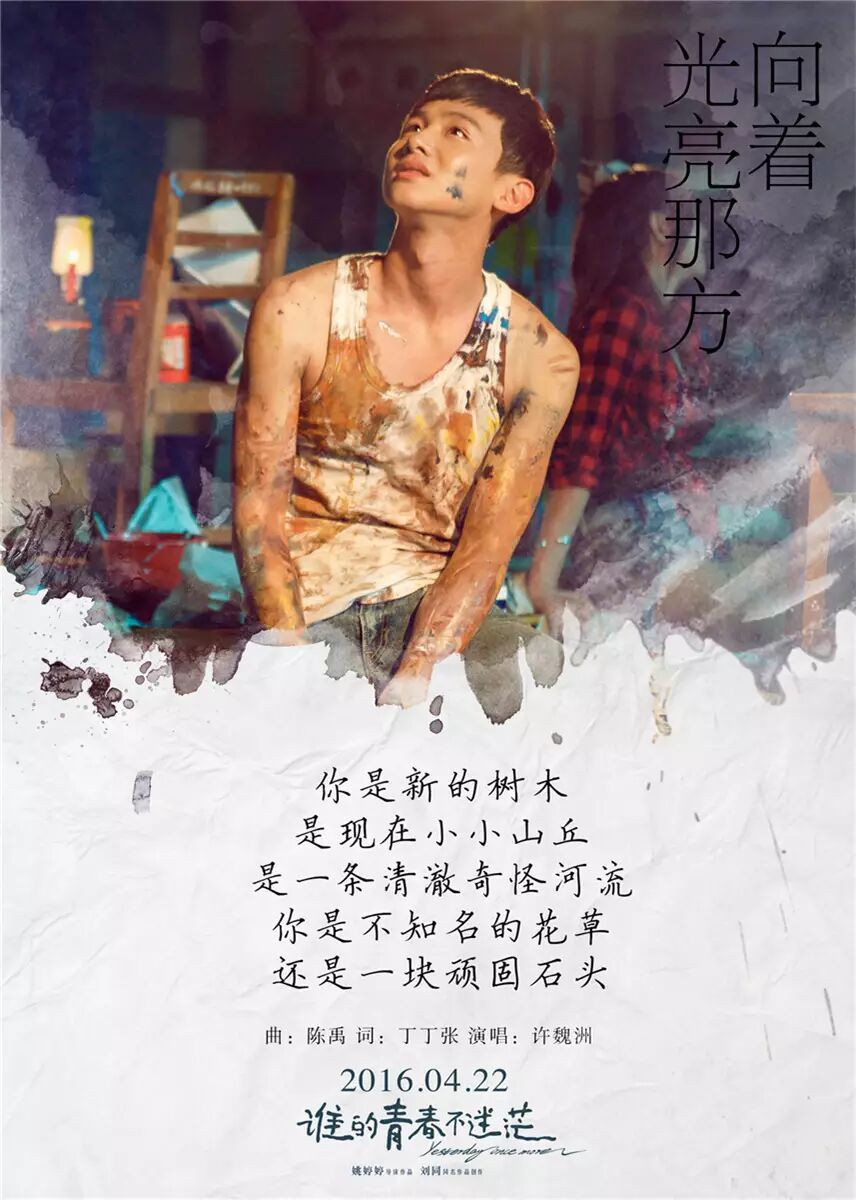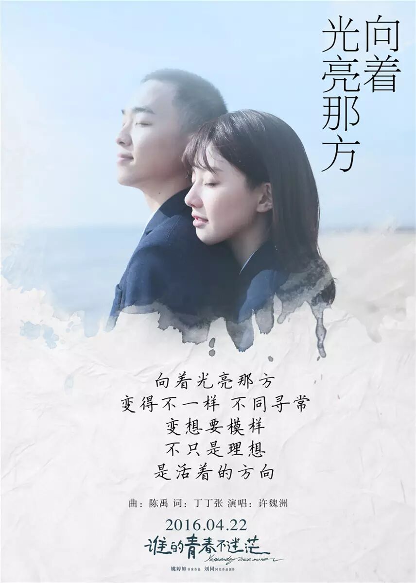 《向着光亮那方》整首歌节奏明快,不管是歌词还是旋律,从主歌的走心到高潮的热血,都充满着青春里独有的力量和希望。和一贯坚持的新人理念一样,电影《谁的青春不迷茫》此次发布的最新推广曲也邀请了新晋人气偶像许魏洲倾情献唱。许魏洲在2016年初的耽美网络剧《上瘾》中正式出道,大受网友欢迎,在第16届音乐风云榜年度盛典更被评为“最受欢迎网剧偶像”。除了表演,许魏洲在音乐方面也有一定积累,在高中时期就组建过乐队,还担任主吉他手。此次许魏洲的演唱,将青春的力量和希望诠释得恰到好处。响亮的旋律配合电影的剧情画面,抒发了青春的无畏和一往无前。青春就要做自己,年轻就是有梦想,迷茫也要向光亮。