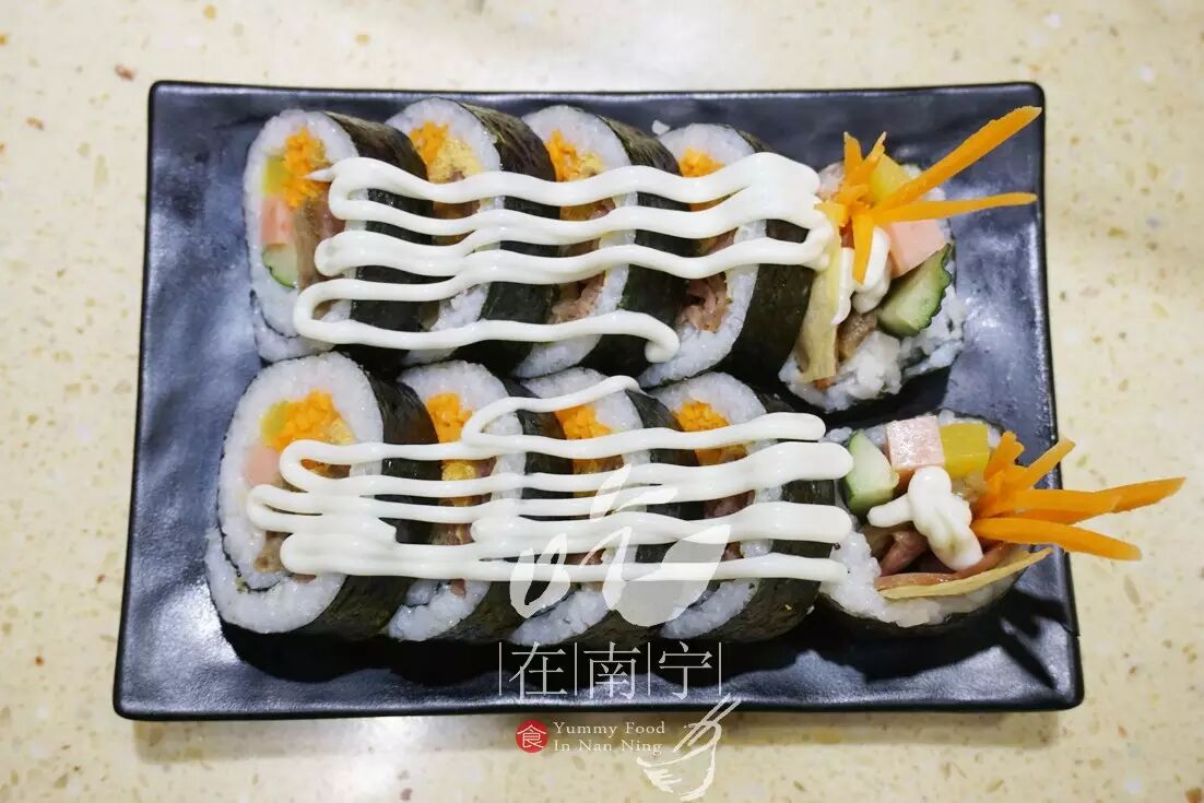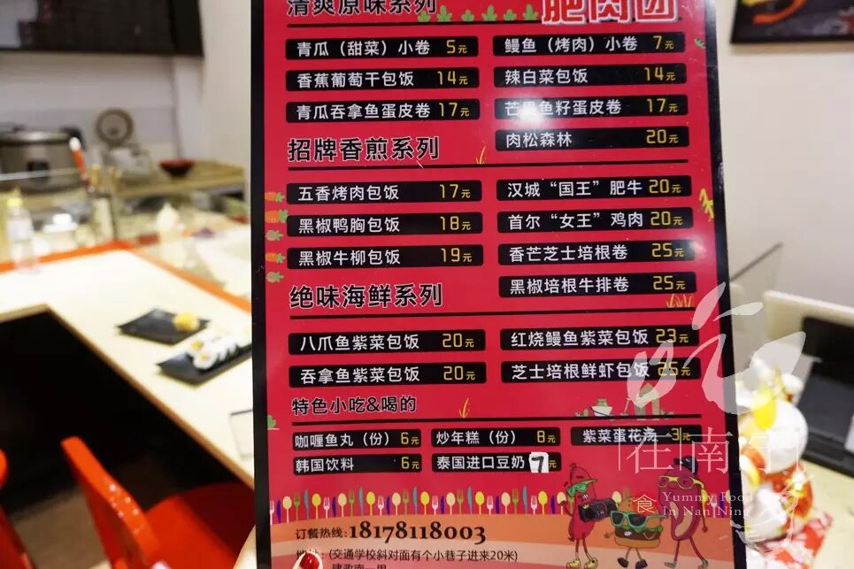 他们家的紫菜包饭有很多种类型,在老板的推荐下,小花尝了两种最受欢迎的,一甜一咸,每一个味道都叫小花难以忘怀。