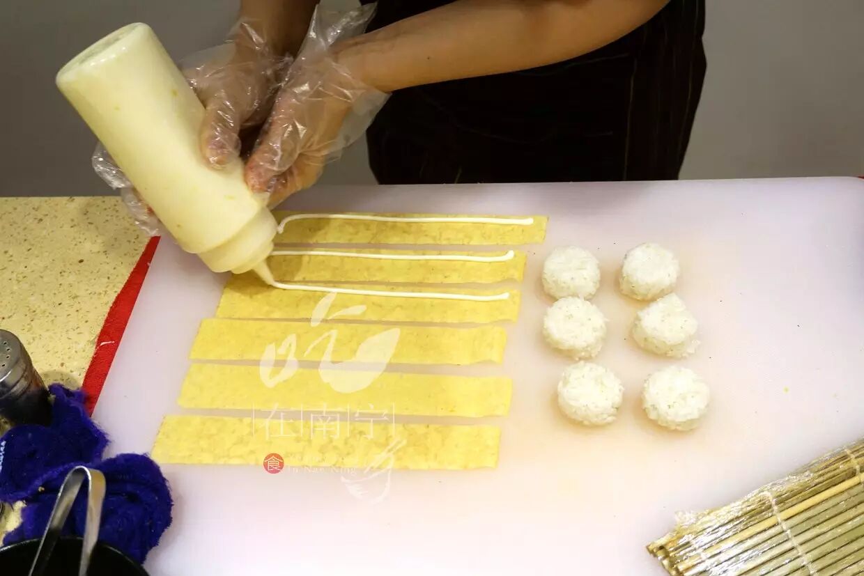 老板说米饭是按照一定比例的用大米、糯米和香油混合的,当中还放了一点点盐,所以吃起来的味道有点咸,和寿司饭完全不一样。