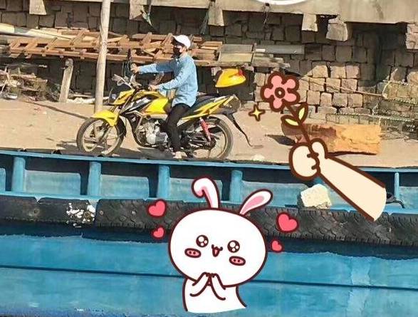 脱了校服,王源穿着一件蓝色衬衣,戴着白帽子黑口罩,撑着一辆黄色的摩托车准备骑。周围有男有女围着他,像是在做技术指导。