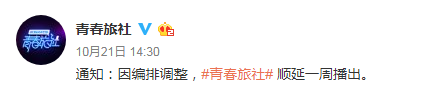 昨天,才更新两集的综艺节目《青春旅社》又受阻,官方回应称:“因编排调整,青春旅社顺延一周播出”。