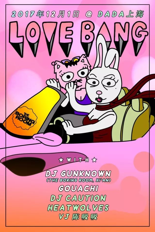 “粉猫神教”Love Bang将回到上海DADA老巢,继续用超现实视效、Hip Hop和低音轰炸你的神经!本次,特别邀请到北京籍长安裔顽固派唱盘主义者 DJ Gunknown aka 大招从古城西安空降上海,并用他独有的“大招式逆向思维”向DADA的蹦迪狂人们发射其“末日情节”脑电波。