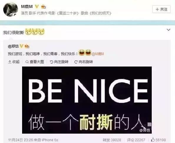 随后,郑恺发微博称:“我们游戏,我们咆哮,我们青春,我们快乐!并@鹿晗。随后,鹿晗转发此微博,写道:“我们很耐撕。