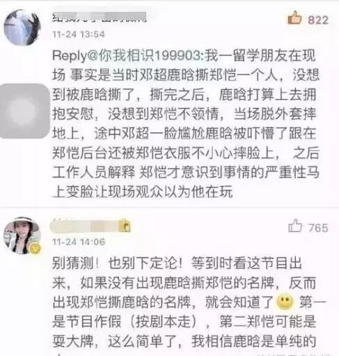 之前跑男在墨尔本录制,当天还是大黑牛生日,但是看似和谐的团队,背地里却不停有撕X上演。在撕名牌环节,剧本安排鹿晗对阵郑恺,没想到郑恺被撕,引起暴怒。为了顾及老成员面子,节目重录,导演最后安排郑恺撕了鹿晗。”并上传了秒拍视频视频显示郑恺脱了衣服直接摔地上,似乎不太高兴。