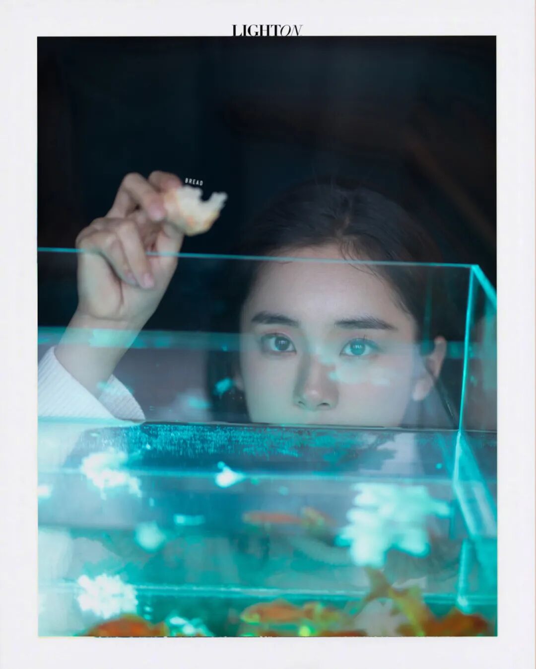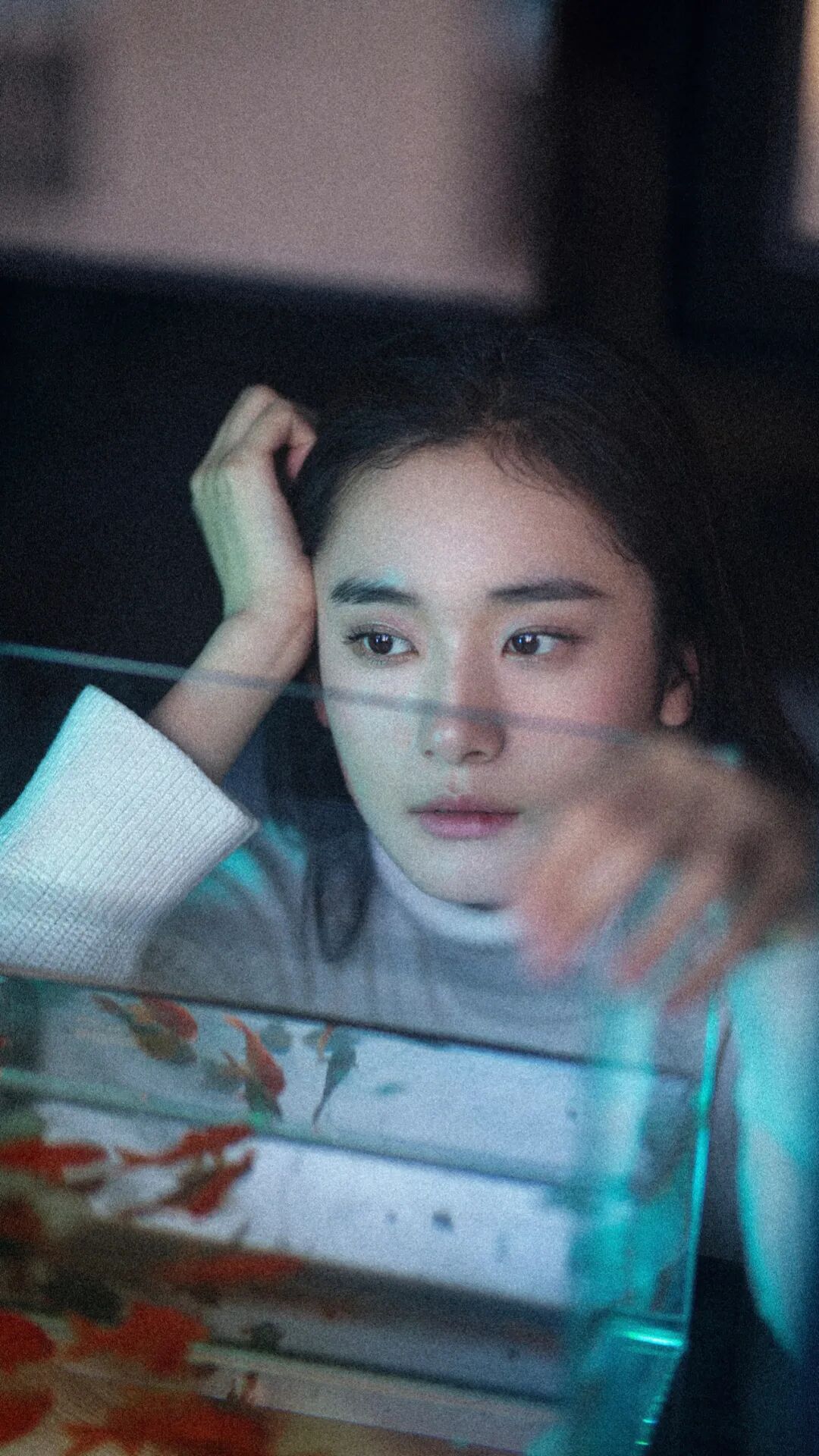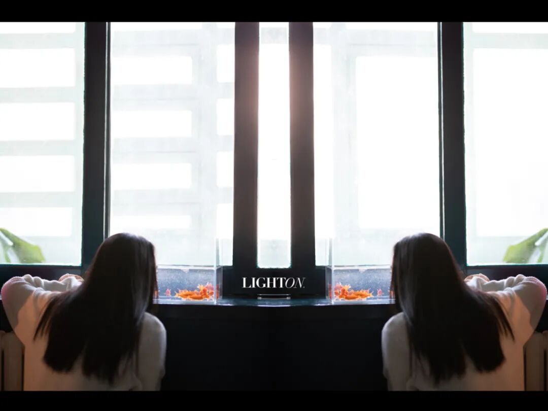 透过玻璃鱼缸,热带灯折射出不同的光影。