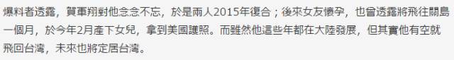 另据台湾媒体最新报道,贺军翔与女友于2015年复合,今后也将会定居台湾