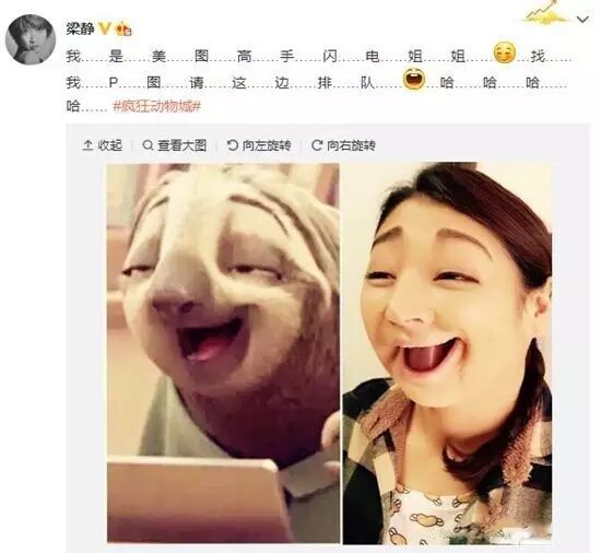 演员梁静在微博晒出模仿《疯狂动物城》中树懒微笑的对比照,同时调皮留言:“我……是……美……图……高……手……闪……电……姐……姐……我……P……图……请……这……边……排……队……哈……哈……哈……哈。”照片中,梁静硬是将自己尖尖的脸蛋P成圆脸,眉毛弧度被下拉,模样与树懒神似。