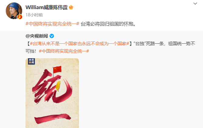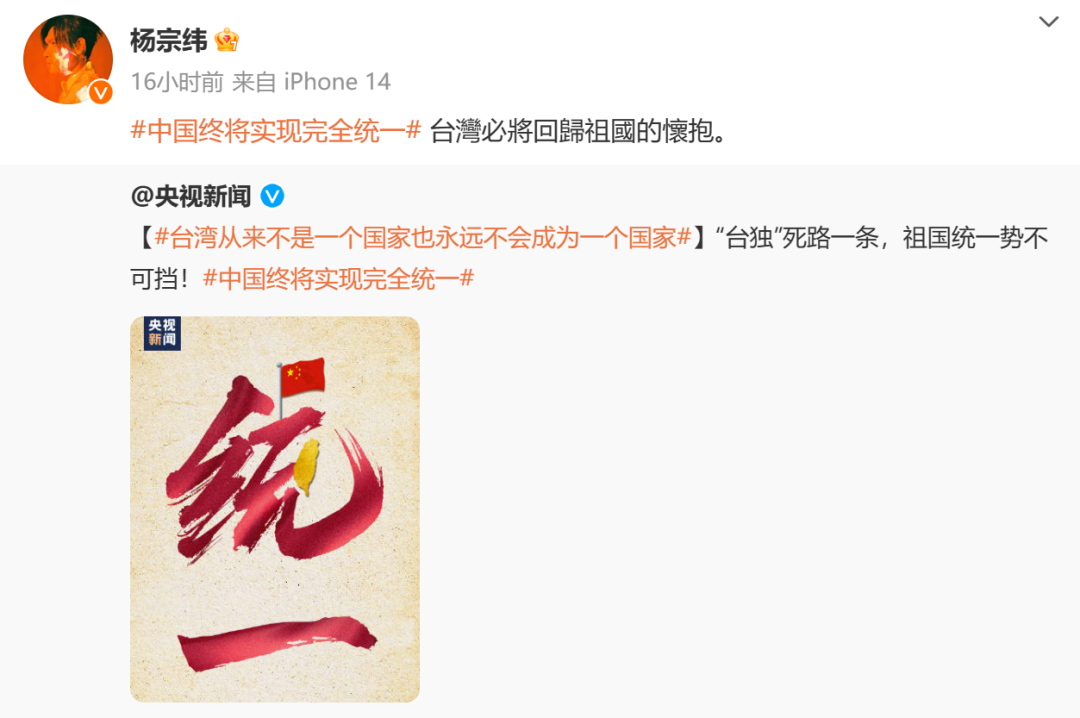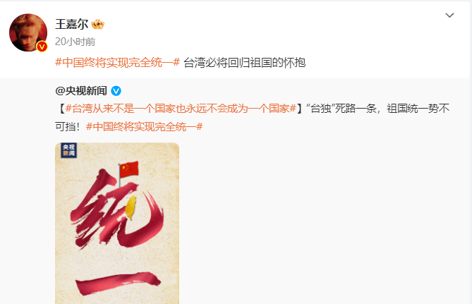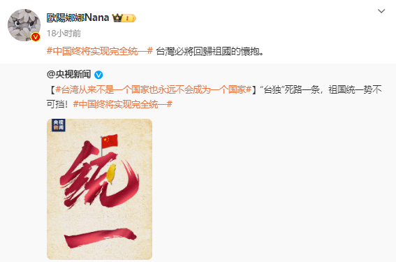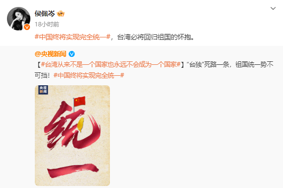《联合报》报道称,这则贴文瞬间登上微博热搜榜,大陆不少一线明星先后转发,岛内艺人侯佩岑、欧阳娜娜也转发,内容是“#中国终将实现完全统一#台湾必将回归祖国的怀抱”。