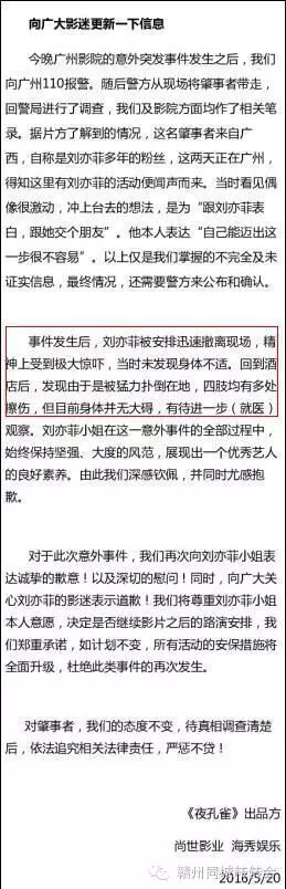 上述申明发出之后,引起了粉丝们的极度不满,可以在上面申请中看出电影出品发说刘亦菲身体并未受伤。但作为围观者的我们都能从画面中看到那强烈的撞击势必会对刘亦菲造成不小的伤害。