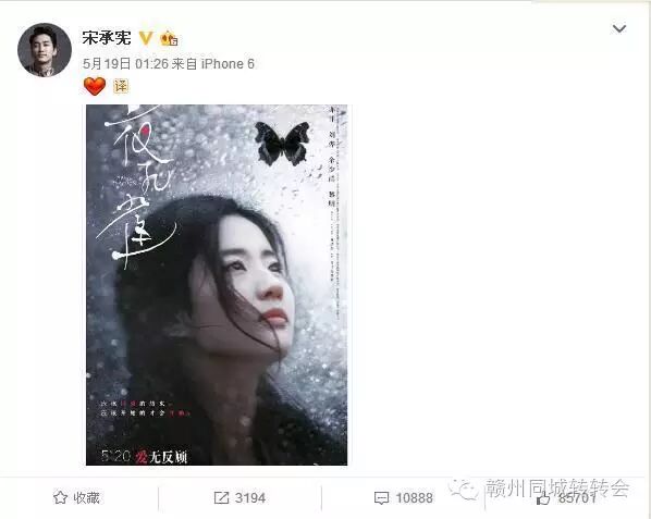 但就在大家传得沸沸扬扬时,宋承宪却在微博上帮女友刘亦菲打起了广告: