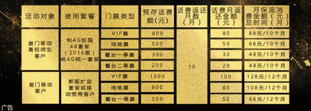 温馨提示:门票限量2500张,办完即止。以上每档活动,每个手机号码仅可参加1次。具体办理详询厦门移动以上指定营业厅。