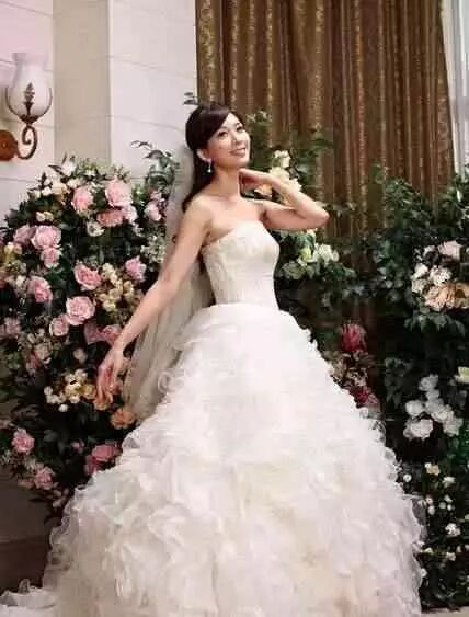 照片上穿着公主装的白色礼服,一脸娇羞非常迷人。